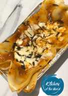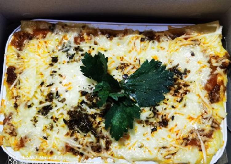 Rebus kulit lasagna selama kurang lebih 3 menit. Lapisan pertama saus bechamel kemudian tutup dengan lasagna matang terakhir tuang saus bolognese di atasnya. - 5 lembar lasagna instan - 100 gram keju mozarella.